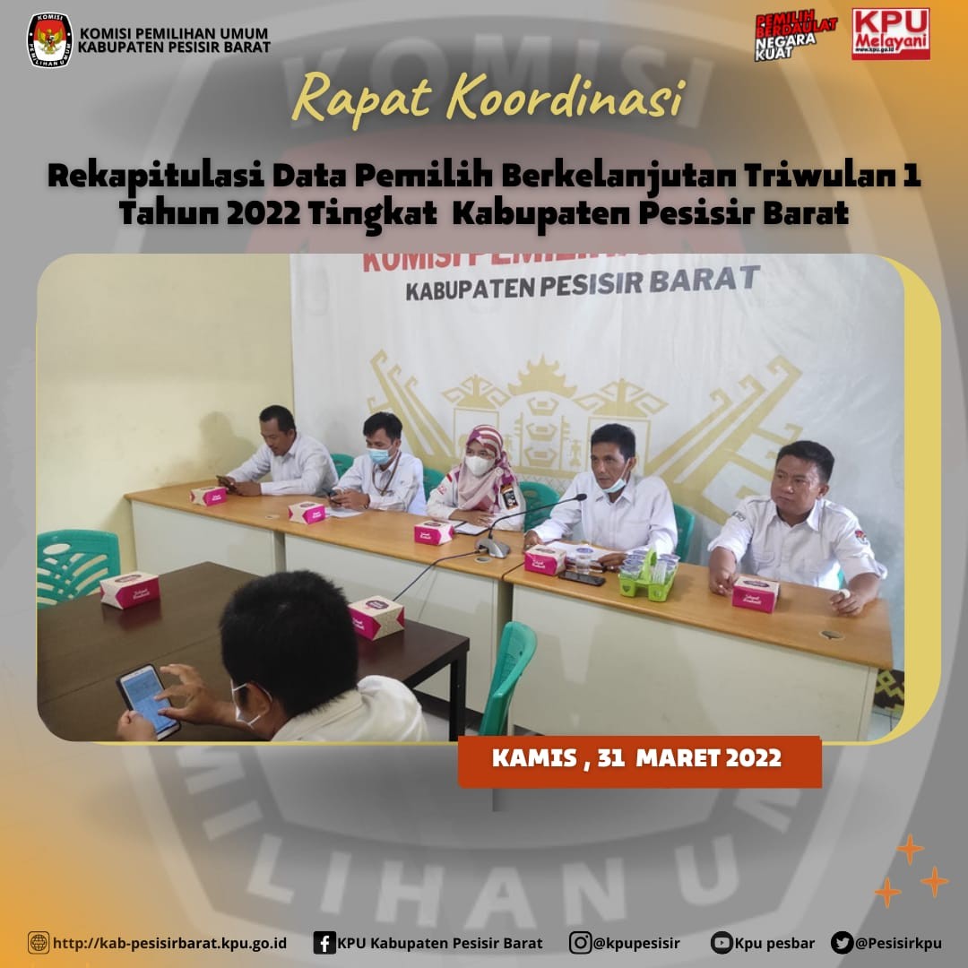 KPU Kabupaten Pesisir Barat pada Kamis (31/03) melaksanakan Rapat Koordinasi Rekapitulasi Data Pemilih Berkelanjutan (DPB) Triwulan 1 Tahun 2022.