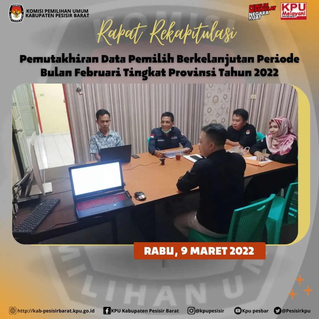 KPU Kabupaten Pesisir Barat Pada hari Rabu, (9/3) Ketua dan Anggota KPU, Sekretaris, Subkoordinator dan Operator Sidalih mengikuti Rapat Koordinasi Rekapitulasi Pemutakhiran Data Pemilih Berkelanjutan (PDPB) Tingkat Provinsi Periode Bulan Februari 2022 yang dilaksanakan Secara Daring.