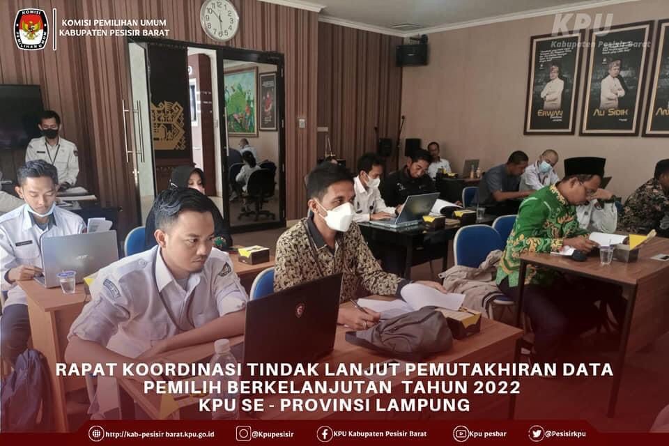 Kegiatan yang dilaksanakan oleh KPU Provinsi Lampung di hadiri oleh seluruh Ketua Divisi Perencanaan, Data, dan Informasi dan Operator Sidalih KPU Kab/Kota Se Provinsi Lampung. Kegiatan ini dimaksudkan dalam rangka tindak lanjut hasil pemadanan Data Pemilih Berkelanjutan Semester II Tahun 2021 Komisi Pemilihan Umum dengan data kependudukan Kementrian Dalam Negeri, khususnya Pemutakhiran Data Pemilih Berkelanjutan KPU Provinsi Lampung.
