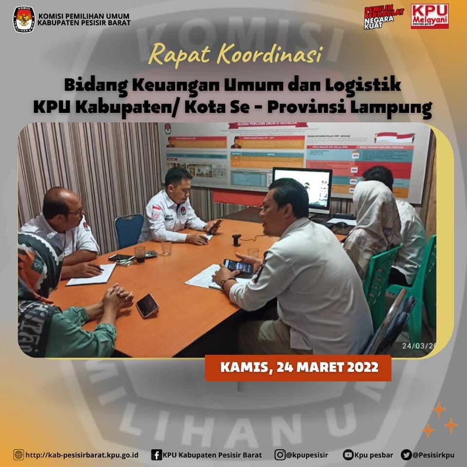 KPU Kabupaten Pesisir Barat pada Kamis, (24/3) Ketua KPU Marlini, SH.I., MA, Sekretaris Donny Zulkarnaen, S. Pd.I , Kasubbag Keuangan Umum dan Logistik Sujarwo Saidi, S. IP, MM beserta staf . Mengikuti Rapat Kordinasi Bidang Keuangan dan Logistik yang di laksanakan oleh KPU Provinsi Lampung via Daring Zoom dan diikuti 15 KPU Kabupaten/Kota Se - Provinsi Lampung terkait telah dilantiknya pejabat pengawas / kepala Subbagian Keuangan, Umum, dan Logistik pada KPU Provinsi Lampung dan 15 KPU Kabupaten / Kota se - Provinsi Lampung.