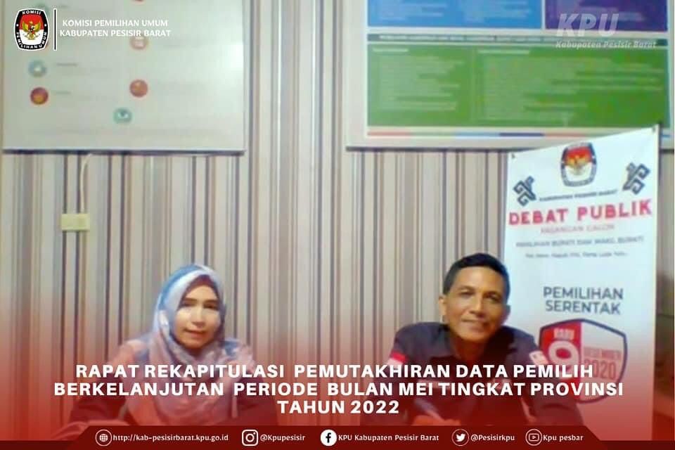 Ketua dan anggota KPU dan Staf Sekretariat KPU Kabupaten Pesisir Barat mengikuti Rapat Rekapitulasi Pemutakhiran Data Pemilih Berkelanjutan Periode Bulan Mei tingkat Provinsi Tahun 2022 yang diselenggarakan oleh KPU Provinsi Lampung secara Secara Daring di ruang kantor KPU Kabupaten Pesisir Barat, Selasa (7/06).