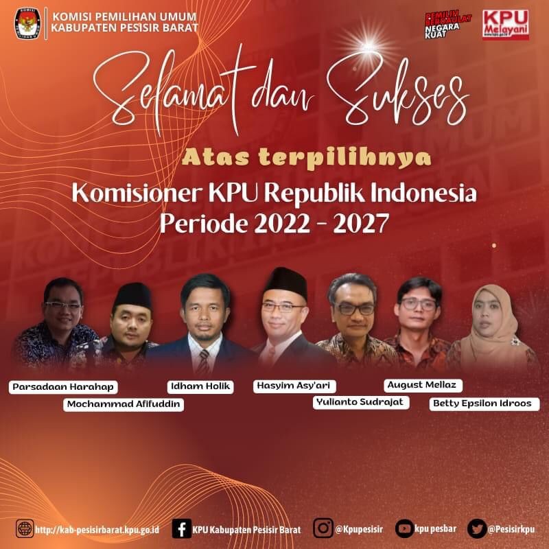 Segenap Jajaran KPU Kabupaten Pesisir Barat Mengucapkan Selamat Atas Terpilihnya Komisioner KPU Republik Indonesia Periode 2022-2027.