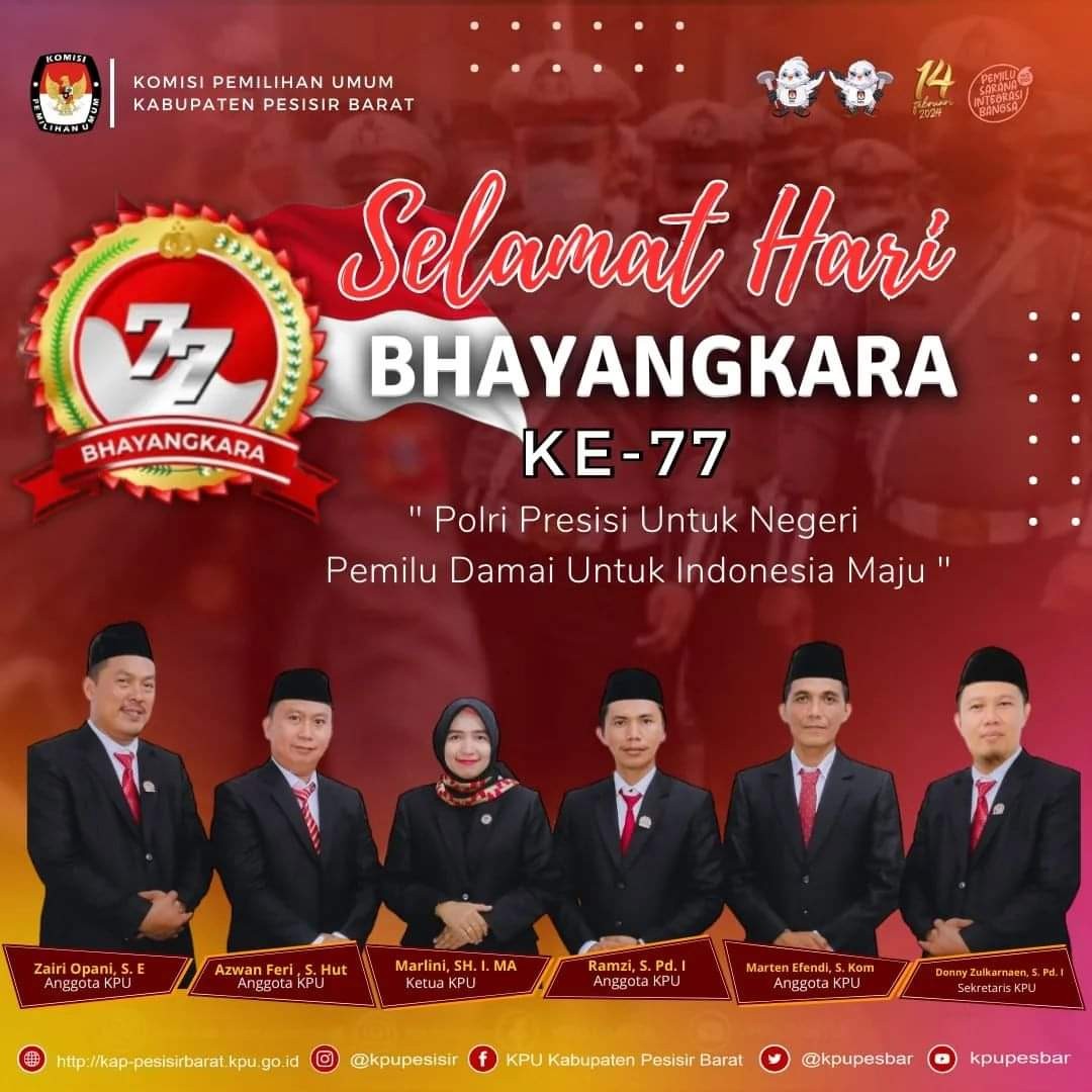 Komisi Pemilihan Umum Kabupaten Pesisir Barat mengucapkan Selamat Hari Bhayangkara ke-77 dengan tema "Polri Presisi untuk Negeri, Pemilu Damai Menuju Indonesia Maju"