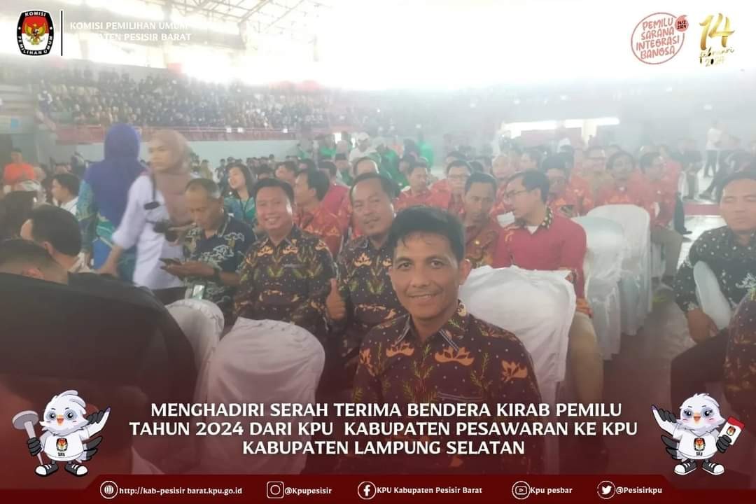 Komisi Pemilihan Umum Kabupaten Pesisir Barat mengikuti acara Serah Terima Bendera Kirab Pemilu Tahun 2024 dari KPU Kabupaten Pesawaran kepada KPU Kabupaten Lampung Selatan yang diselenggarakan oleh KPU Kabupaten Lampung Selatan di Gor Way Handak, Lampung Selatan, Jumat (13/10/23).