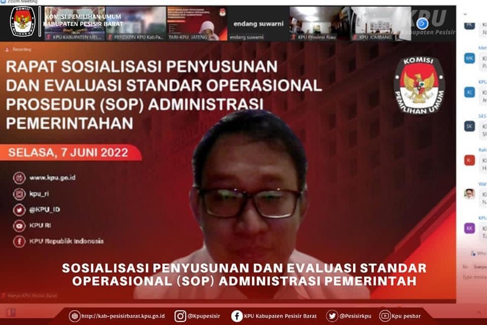 ASN Sekretariat KPU Kabupaten Pesisir Barat mengikuti kegiatan Sosialisasi Penyusunan dan Evaluasi Standar Operasional Prosedur (SOP) Administrasi Pemerintahan yang diselenggarakan oleh KPU Republik Indonesia secara daring (dalam jaringan) di Aula Kantor KPU Kabupaten Pesisir Barat, pada Selasa (07/06).