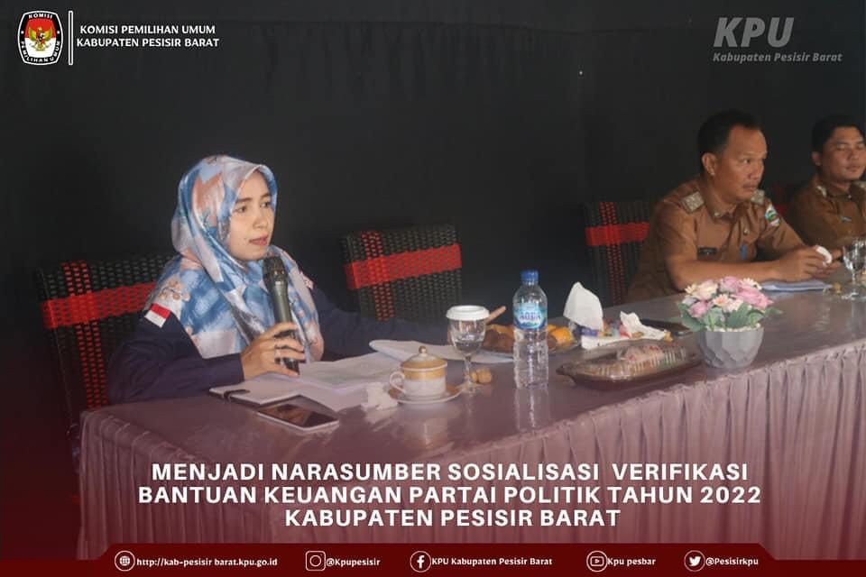 Ketua KPU Pesisir Barat Marlini, S.H.I, MA. dan Sekretaris KPU Pesisir Barat Donny Zulkarnaen, S. Pd. I. beserta staf , Selasa (19/7) Mengikuti Sosialisasi Verifikasi Bantuan Keuangan Partai Politik Tahun 2022 yang di selegarakan oleh Kesbangpol Kabupaten Pesisir Barat.